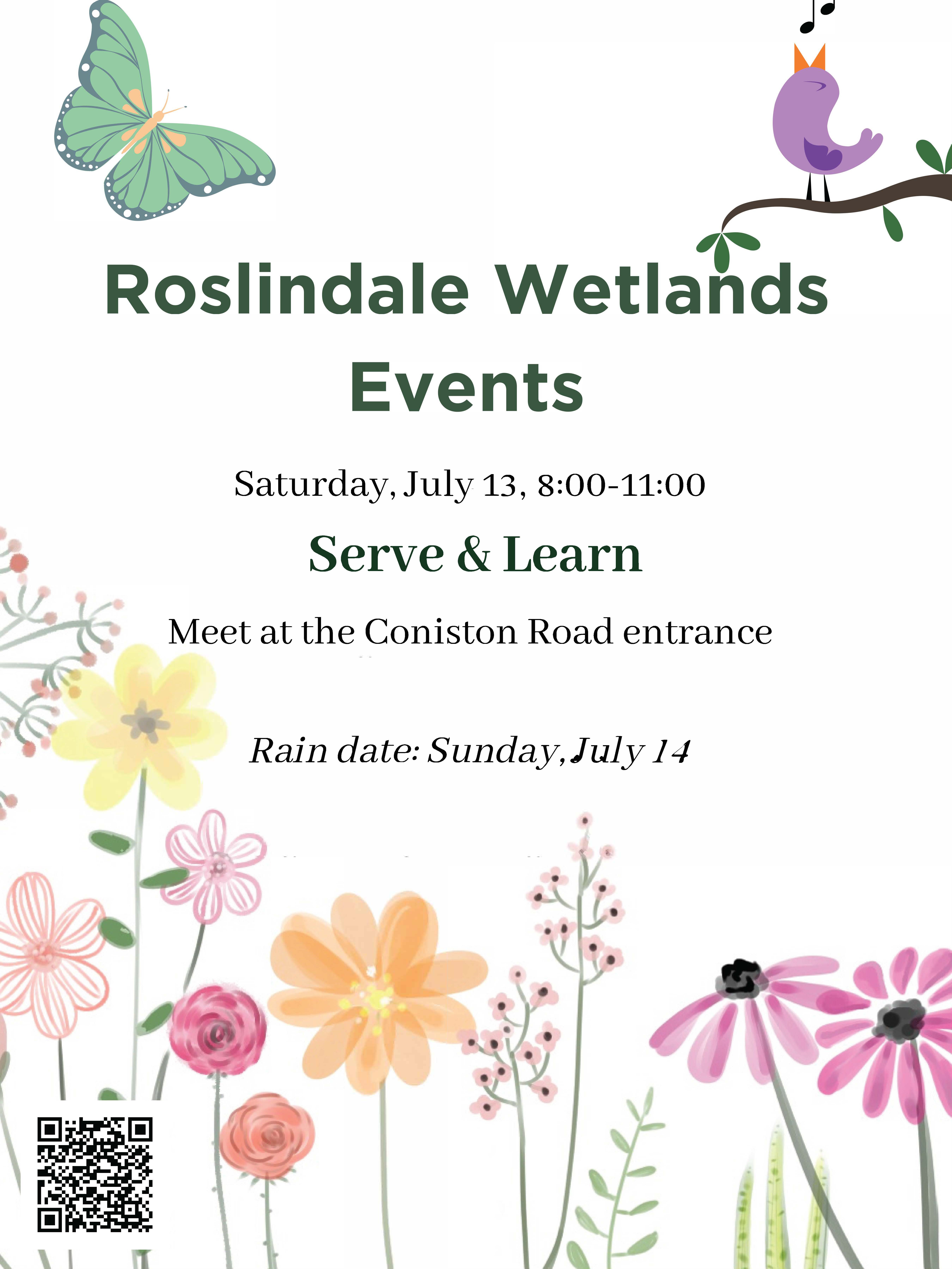 Due to Rain Forecast… Saturday’s Serve & Learn at the Roslindale Wetlands has been postponed to Sunday, July 14th from 8 am to 11 am. Meet up at the Coniston Road Entrance.